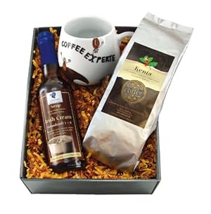 Handschmeichelnder Porzellanbecher mit Druck Coffee Experte, 250 g exklusive Kaffeespezialität aus Kenia (100% Arabica, ganze Bohnen, doppelt handverlesen und schonend geröstet für ausgezeichnetes Aroma), 350 ml aromatischer Sirup Irish Cram (für Kaffee, Eis, Desserts, etc.), Geschenkbox ca. 26 x 18 x 9 cm